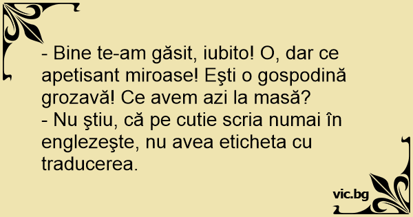 - Bine te-am găsit, iubito! O, dar ce apetisant miroase! Eşti o gospodină grozavă! Ce avem azi la masă?