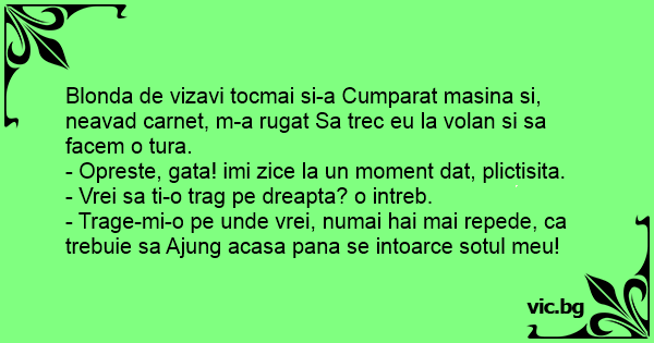 Blonda de vizavi tocmai si-a Cumparat masina si, neavad carnet, m-a rugat Sa trec eu la volan si sa facem o tura.