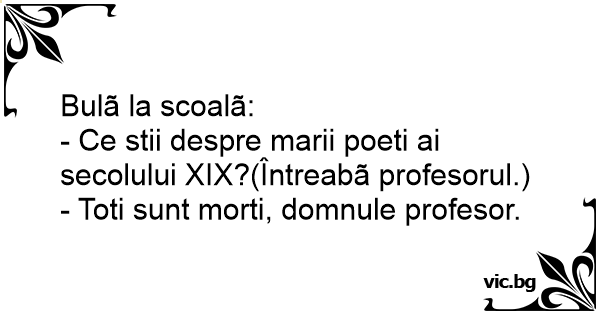 Учителят: - И така, какво знаеш за великите поети на XIX век? - Всички са мъртви, господине