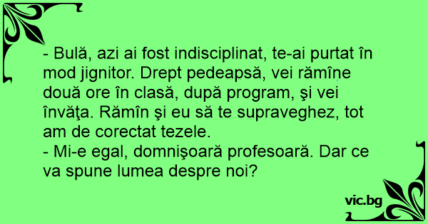 - Bulă, azi ai fost indisciplinat, te-ai purtat în mod jignitor. Drept pedeapsă, vei rămîne două ore în clasă, după program, şi vei învăţa. Rămîn şi eu să te supraveghez, tot am de corectat tezele.