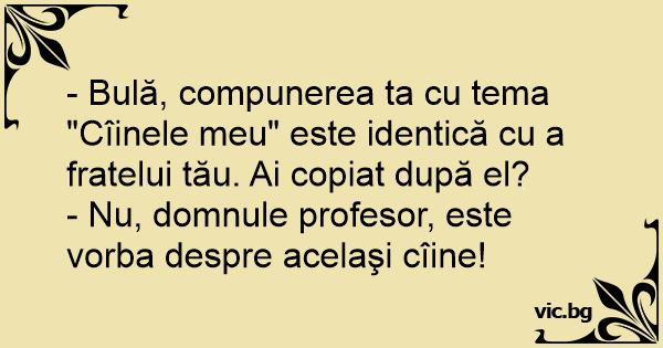 - Bulă, compunerea ta cu tema "Cîinele meu" este identică cu a fratelui tău. Ai copiat după el?