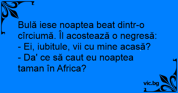 Bulă iese noaptea beat dintr-o cîrciumă. Îl acostează o negresă: