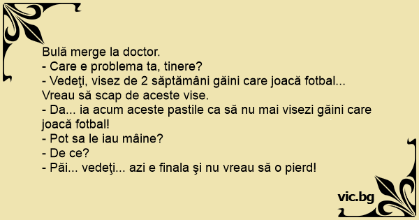 - Da... ia acum aceste pastile ca să nu mai visezi găini care joacă fotbal!