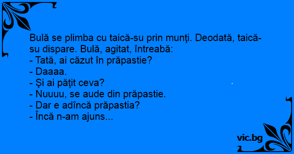 Bulă se plimba cu taică-su prin munţi. Deodată, taică-su dispare. Bulă, agitat, întreabă: