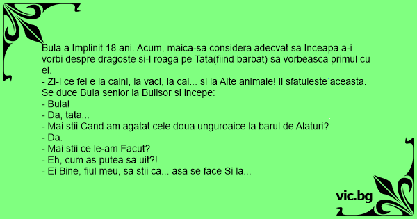 Bula a Implinit 18 ani. Acum, maica-sa considera adecvat sa Inceapa a-i vorbi despre dragoste si-l roaga pe Tata(fiind barbat) sa vorbeasca primul cu el.