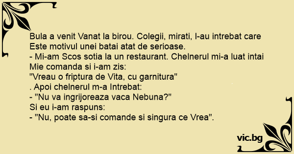 Bula a venit Vanat la birou. Colegii, mirati, l-au intrebat care Este motivul unei batai atat de serioase.
