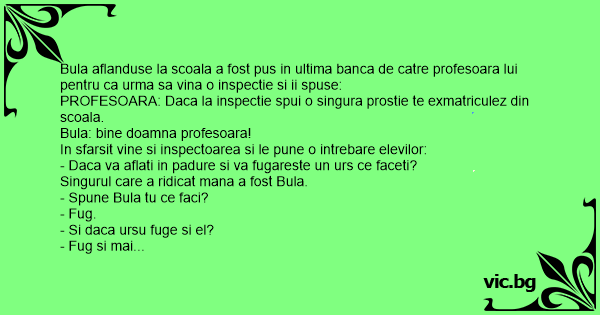 Bula aflanduse la scoala a fost pus in ultima banca de catre profesoara lui pentru ca urma sa vina o inspectie si ii spuse: