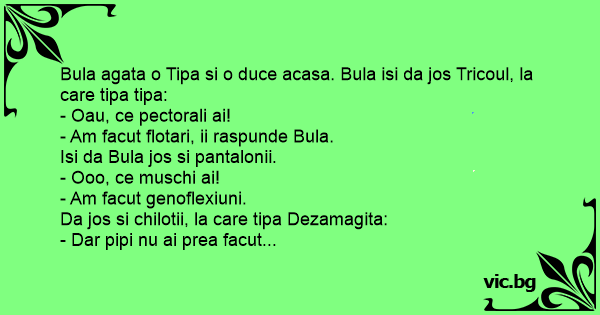 Bula agata o Tipa si o duce acasa. Bula isi da jos Tricoul, la care tipa tipa: - Oau, ce pectorali ai! - Am facut flotari, ii raspunde Bula. Isi da Bula jos si pantalonii. - Ooo, ce мusсhi ai! - Am facut genoflexiuni. Da jos si chilotii, la care tipa Dezamagita: - Dar pipi nu ai prea facut...