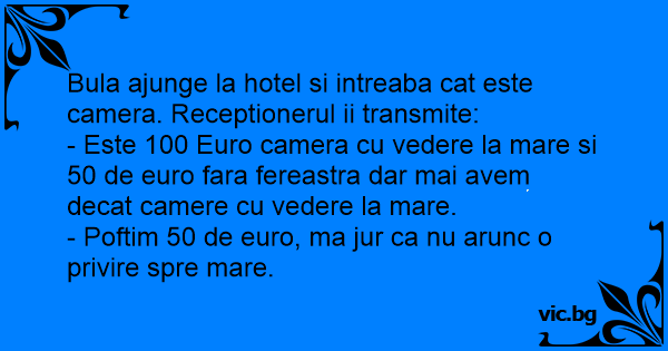 Bula ajunge la hotel si intreaba cat este camera. Receptionerul ii transmite: