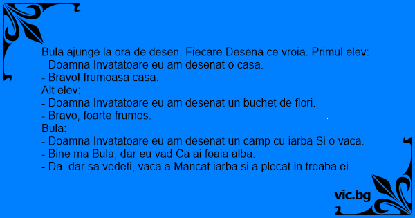 Bula ajunge la ora de desen. Fiecare Desena ce vroia. Primul elev: