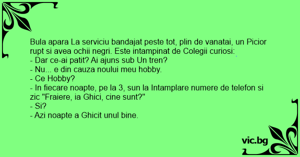 Bula apara La serviciu bandajat peste tot, plin de vanatai, un Picior rupt si avea ochii negri. Este intampinat de Colegii curiosi: