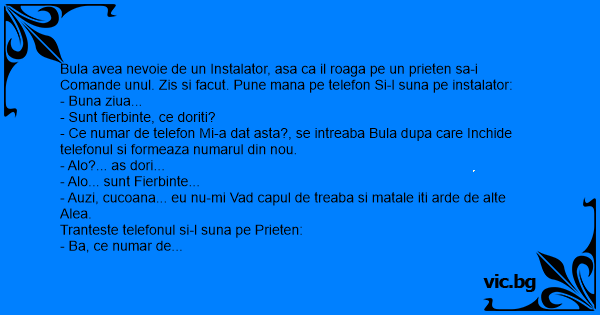 Bula avea nevoie de un Instalator, asa ca il roaga pe un prieten sa-i Comande unul. Zis si facut. Pune mana pe telefon Si-l suna pe instalator: