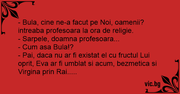 - Pai, daca nu ar fi existat el cu fructul Lui oprit, Eva ar fi umblat si acum, bezmetica si Virgina prin Rai.....