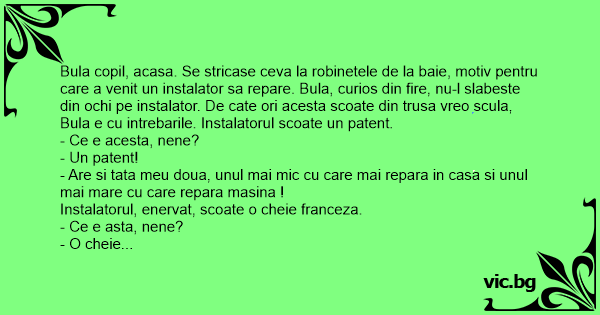 Bula copil, acasa. Se stricase ceva la robinetele de la baie, motiv pentru care a venit un instalator sa repare. Bula, curios din fire, nu-l slabeste din ochi pe instalator. De cate ori acesta scoate din trusa vreo scula, Bula e cu intrebarile. Instalatorul scoate un patent.
