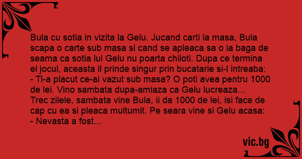 Bula cu sotia in vizita la Gelu. Jucand carti la masa, Bula scapa o carte sub masa si cand se apleaca sa o ia baga de seama ca sotia lui Gelu nu poarta chiloti. Dupa ce termina ei jocul, aceasta il prinde singur prin bucatarie si-l intreaba: