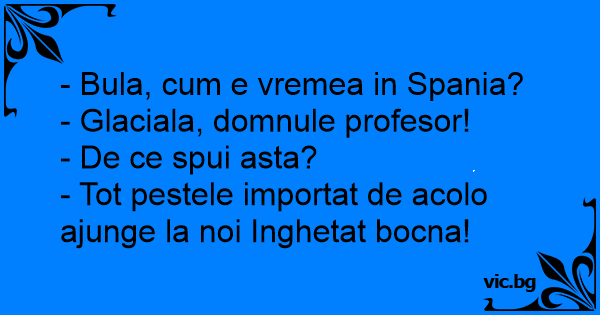 - Bula, сuм e vremea in Spania?<br />- Glaciala, domnule profesor!<br />- De ce spui asta?<br />- Tot pestele importat de acolo ajunge la noi Inghetat bocna!