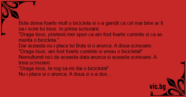 Bula dorea foarte mult o bicicleta si s-a gandit ca cel mai bine ar fi sa-i scrie lui Iisus. In prima scrisoare: