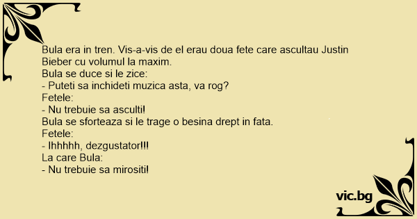 Bula era in tren. Vis-a-vis de el erau doua fete care ascultau Justin Bieber cu volumul la maxim.