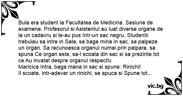 Bula era student la Facultatea de Medicina. Sesiune de examene. Profesorul si Asistentul au luat diverse organe de la un cadavru si le-au pus Intr-un sac negru. Studentii trebuiau sa intre in Sala, sa bage mina in sac, sa palpeze un оrgаn, Sa recunoasca organul numai prin palpare, sa spuna Ce оrgаn este, sa-l scoata din sac si sa prezinte tot ce Au invatat despre organul respectiv.