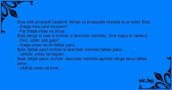 Bula este proaspat casatorit. Merge cu proaspata nevasta la un hotel. Bula: