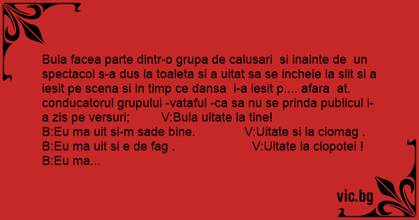 Bula facea parte dintr-o grupa de calusari si inainte de un spectacol s-a dus la toaleta si a uitat sa se incheie la slit si a iesit pe scena si in timp ce dansa i-a iesit p.... afara at. conducatorul grupului -vataful -ca sa nu se prinda publicul i-a zis pe versuri; V:Bula uitate la tine! B:Eu ma uit si-m sade bine. V:Uitate si la ciomag . B:Eu ma uit si e de fаg . V:Uitate la clopotei ! B:Eu ma uit joaca si ei . V:Uitate si la opinci!!! B:A!!!! de P.... A zici!!!!!!