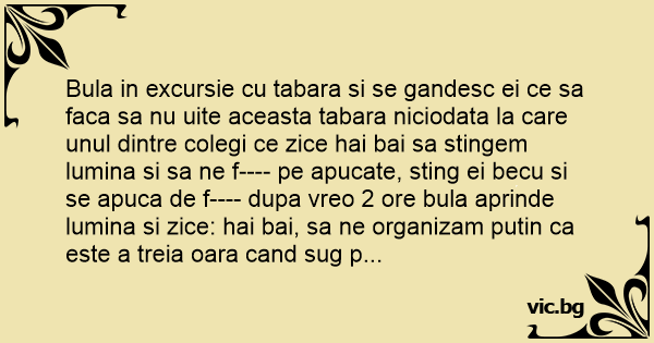 Bula in excursie cu tabara si se gandesc ei ce sa faca sa nu uite aceasta tabara niciodata la care unul dintre colegi ce zice hai bai sa stingem lumina si sa ne f---- pe apucate, sting ei becu si se apuca de f---- dupa vreo 2 ore bula aprinde lumina si zice: hai bai, sa ne organizam putin ca este a treia oara cand sug p...