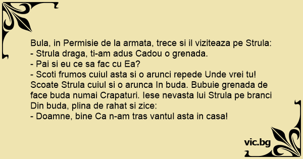 Scoate Strula cuiul si o arunca In buda. Bubuie grenada de face buda numai Crapaturi. Iese nevasta lui Strula pe branci Din buda, plina de rahat si zice: