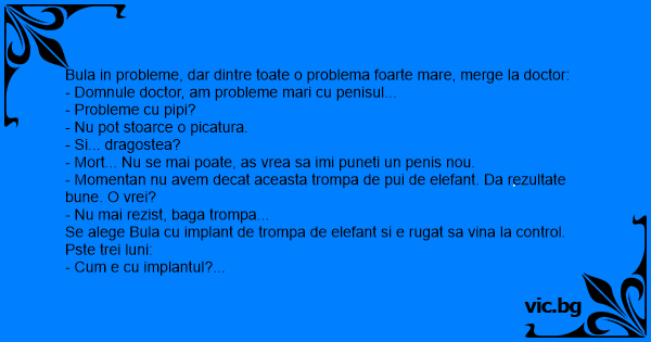 Se alege Bula cu implant de trompa de elefant si e rugat sa vina la control. Pste trei luni: