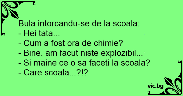 - Ce-ati facut bai azi la scoala? - Materiale explozive. - Marfa. Si miine ce program aveti la scoala? - Care scoala?