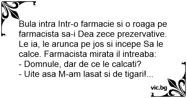 Bula intra Intr-o farmacie si o roaga pe farmacista sa-i Dea zece prezervative. Le ia, le arunca pe jos si incepe Sa le calce. Farmacista mirata il intreaba: