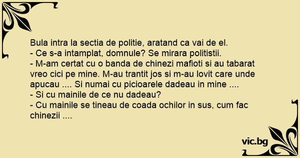 - M-am certat cu o banda de chinezi mafioti si au tabarat vreo cici pe mine. M-au trantit jos si m-au lovit care unde apucau .... Si numai cu picioarele dadeau in mine ....