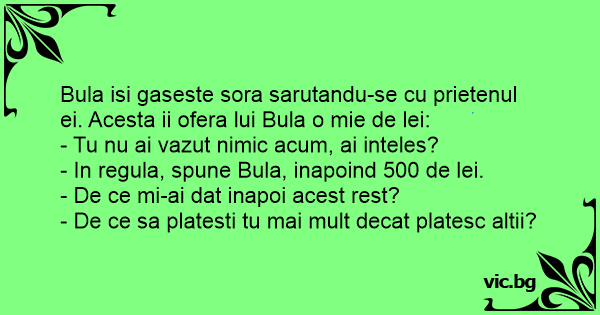 Bula isi gaseste sora sarutandu-se cu prietenul ei. Acesta ii ofera lui Bula o mie de lei: