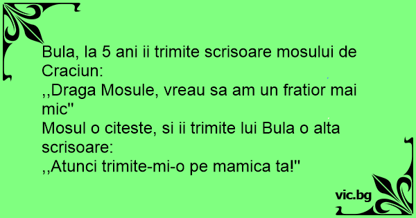 Un copilas ii scrie lui Mos Craciun: - Trimite-mi un fratior Mos Craciun raspunde: - Trimite-mi-o mai intaii pe mata.