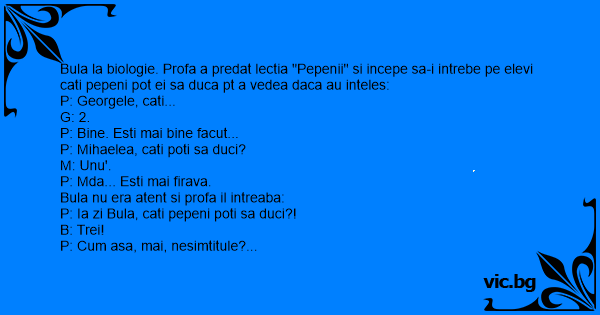 Bula la biologie. Profa a predat lectia "Pepenii" si incepe sa-i intrebe pe elevi cati pepeni рот ei sa duca pt a vedea daca au inteles: