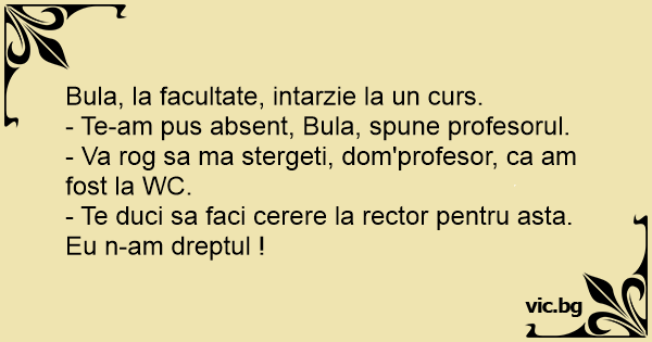 - Va rog sa ma stergeti, dom'profesor, ca am fost la WC.