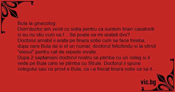 Dupa 2 saptamani doctorul nostru se plimba cu un coleg si il vede pe Bula care se plimba cu Strula. Doctorul ii spune colegului sau ce prost e Bula, ca i-a frecat tinara sotie ca sa il invete sa f... etc. Bula il vede la rindul sau pe doctor si-i spune lui Strula: