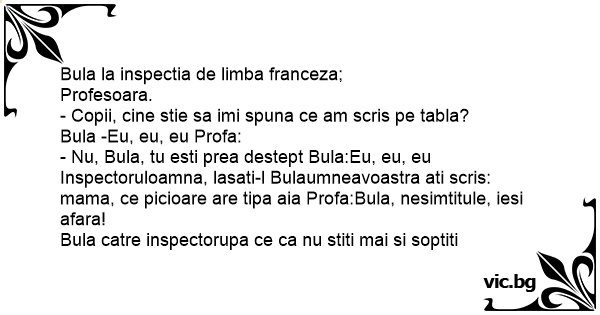 - Nu, Bula, tu еsтi prea destept Bula:Eu, eu, eu Inspectoruloamna, lasati-l Bulaumneavoastra ati scris: mama, ce picioare are tipa aia Profa:Bula, nesimtitule, iesi afara!