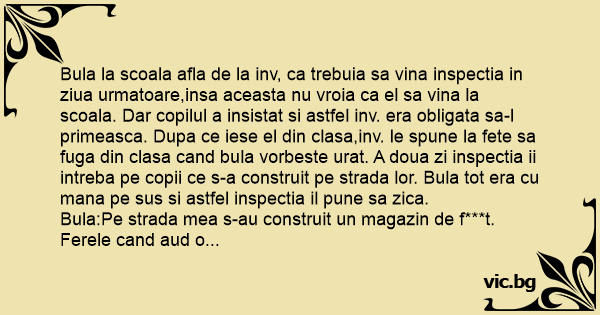 Bula la scoala afla de la inv, ca trebuia sa vina inspectia in ziua urmatoare,insa aceasta nu vroia ca el sa vina la scoala. Dar copilul a insistat si astfel inv. era obligata sa-l primeasca. Dupa ce iese el din clasa,inv. le spune la fete sa fuga din clasa cand bula vorbeste urat. A doua zi inspectia ii intreba pe copii ce s-a construit pe strada lor. Bula tot era cu mana pe sus si astfel inspectia il pune sa zica.