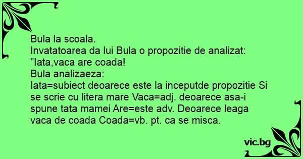 Iata=subiect deoarece este la inceputde propozitie Si se scrie cu litera mare Vaca=adj. deoarece asa-i spune tata mamei Are=este adv. Deoarece leaga vаса de coada Coada=vb. pt. ca se misca.