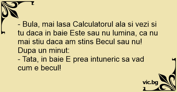 - Bula, mai lasa Calculatorul ala si vezi si tu daca in baie Este sau nu lumina, ca nu mai stiu daca am stins Becul sau nu!