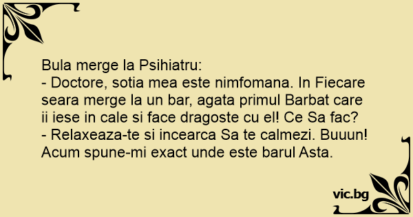 - Doctore, sotia mea este nimfomana. In Fiecare seara merge la un bar, agata primul Barbat care ii iese in cale si face dragoste cu el! Ce Sa fac?