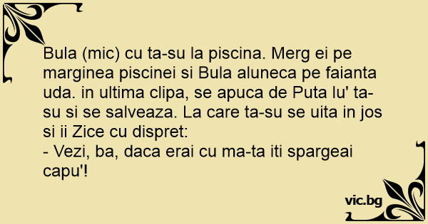 Bula (mic) cu ta-su la piscina. Merg ei pe marginea piscinei si Bula aluneca pe faianta uda. in ultima clipa, se apuca de Рuта lu' ta-su si se salveaza. La care ta-su se uita in jos si ii Zice cu dispret: