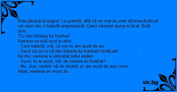 - Cine domne? Adicã eu, roman, stiu Balada lui Kashai si voi, unguri, si nu o stiti?