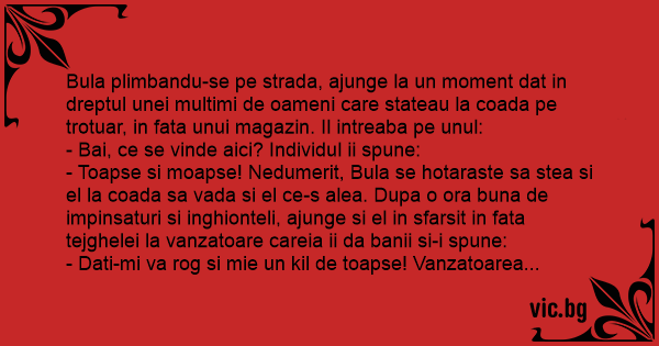 - Dati-mi va rog si mie un kil de toapse! Vanzatoarea le cantareste si i le pune intr-o punga. Fericit Bula ca a reusit si el sa ia ceva, se impinge prin multimea de oameni ca sa ajunga afara. Ajuns afara se uita curios in punga ca sa vada сuм arata toapsele si spune: