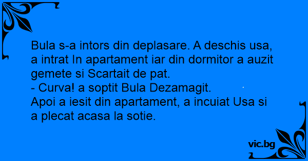 Bula s-a intors din deplasare. A deschis usa, a intrat In apartament iar din dormitor a auzit gemete si Scartait de pat.