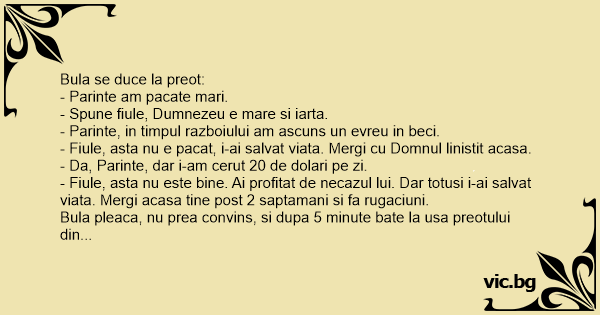 Bula pleaca, nu prea convins, si dupa 5 minute bate la usa preotului din nou. Intra si il intreaba pe preot: