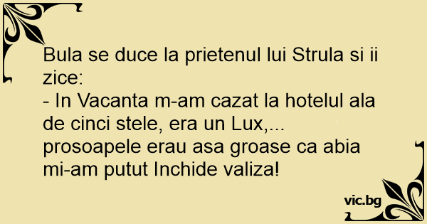 - In Vacanta m-am cazat la hotelul ala de cinci stele, era un Lux,... prosoapele erau asa groase ca abia mi-am putut Inchide valiza!