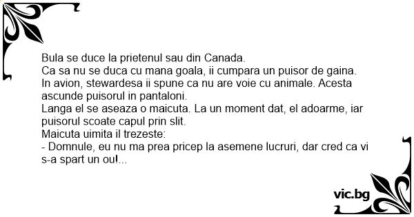 In avion, stewardesa ii spune ca nu are voie cu animale. Acesta ascunde puisorul in pantaloni.