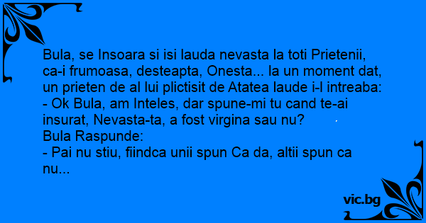 - Ok Bula, am Inteles, dar spune-mi tu cand te-ai insurat, Nevasta-ta, a fost virgina sau nu?