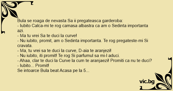 Se intoarce Bula beat Acasa pe la 5 dimineata si ii spune sotiei :